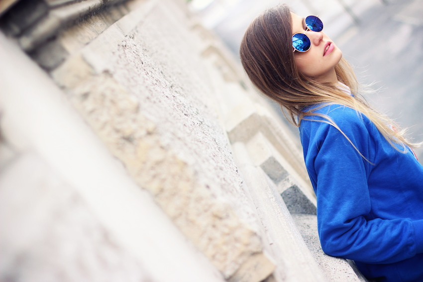 AZUL. Un pantalón de vestir y camisa blanca pueden dejar de ser formales y convertirse en un look divertido si te pones, por ejemplo, una sudadera, gafas y botines coloridos...qué os parece?