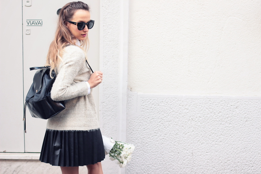 La mochila, mocasines, falda plisada y camisa hacen que este look tenga un aspecto muy colegial. Respecto al jersey, es de los más suave y abrigado, será de mis preferidos este invierno.